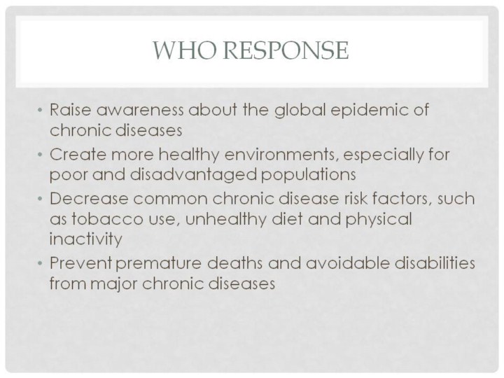 “WHO also leads the Global Alliance against Chronic Respiratory Diseases (GARD), a voluntary alliance of national and international organizations, institutions, and agencies working towards the common goal of reducing the global burden of chronic respiratory diseases. Its vision is a world where all people breathe freely. GARD focuses specifically on the needs of low- and middle-income countries and vulnerable populations.” -The World Health Organization website (http://www.who.int/mediacentre/factsheets/fs315/en/) |
