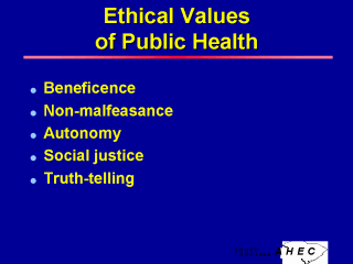 These are the basic building blocks of an ethics of health. Beneficence is the principle of doing good with every action. Non-malfeasance is the principle of avoiding harm if at all possible. Autonomy is the principle of individual decision-making, respecting the right of each human to make his or her own life choices. Social justice requires that like cases (of anything) be treated in like manner and that every individual’s right to social justice be respected. Truth-telling demands that accurate information be available to all participants in any information exchange or decision-making situation. In the case of health and illness care, these are often seen as being in tension, as it is not always possible to fully act on any one of them without violating another. For example, truth telling may cause harm, and full autonomy for some people leads them to do harm to others. |
