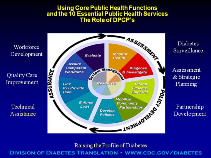 Using the 10 Essential Public Health Services as a Framework upon which we can identify gaps in the public health infrastructure and opportunities to build from a position of strength, the DPCP’s work with their partners to raise awareness about diabetes within the at-large community and provide technical assistance in the areas where we can strengthen the ways in which patient care is provided, patient outcomes are measured and policies are implemented to improve access to care and/or services. |