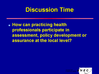| This discussion should be particularized to the professions represented in the class, but might include issues of responsibility for disease reporting, participation on boards and committees, contributions of services to voluntary organizations or role modeling healthy behavior. |