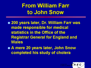 Farr’s contribution is the tradition of using vital statistical data to study health problems. His studies compared married to single persons, workers in different occupations (metal mines and earthenware industry), elevations above sea level, and the effects of incarceration. If your class did not complete Module 1a, you might want to include at this point the slides from that module on John Snow and cholera in London, which provide a dramatic illustration of epidemiologic analysis. |