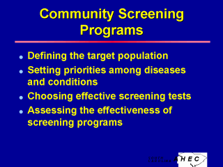 - After identifying a particular population in need of intervention, organizers must decide what health conditions or diseases should be given priority for new or expanded efforts. Potential criteria for ranking include disease burden, availability of effective screening test(s); availability of effective treatment and follow-up; and cost-effectiveness.