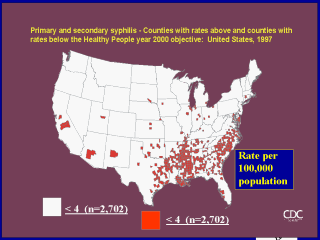 Key points: - Syphilis rates by county, for counties with rates > HP 2000 - Prevalence - Geographic distribution – different information than previous chart - Implications for practice