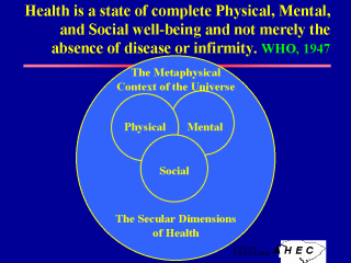 Definition of Health “health is the state of complete physical, mental, and social well-being, and not merely the absence of disease.” This definition acknowledges that health includes the mental aspects of our being and the fact that as human beings, we need social networks in order to thrive as well. It depicts the metaphysical, which some might say is related to the spiritual dimension, and the secular aspects of health. Some have thought this to be a much broader and practical way to think about health. However, others have argued that using the term “complete well-being” is unrealistic because even at their best, most people still feel there are areas of their health that could use improvement. It is interesting to discuss our thoughts about health and to understand that health is a subjective rather than an objective concept. |