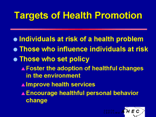 The causes of any one health problem are multi-factorial and interrelated. For example: a teenager with asthma may have: Solutions to these problems using the processes of health promotion would target both the individual related to using an inhaler and the family related to second hand smoking consequence. In addition, it would target people who set policy at schools and those who can help to improve health services for this family. Health promotion is considered “multi-tiered” because it involves various levels of society to help address a health problem. |