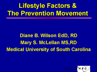 Dr. Diane Baer Wilson is Associate Professor in the College of Dental Medicine, Medical University of South Carolina. Her clinical training is in nutrition and she earned her Master's degree from Louisiana State University. After a career of consulting and teaching, she earned her doctorate in Health Education Administration in 1991 from the School of Public Health at the University of South Carolina.