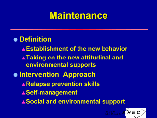 Maintenance The goal during maintenance is to adopt necessary attitudes and establish an environment that will enable a new behavior to become a lifelong practice. There may be strong issues to work against for a given individual to ensure that they will not relapse. As we know, many new health behaviors do not survive long term. Individuals must take on new attitudes, knowledge and beliefs to be successful. Have you tried to change a lifestyle behavior? Discuss among your group what your experiences have been-what strategies worked or did not work for you? We have discussed in this module how deeply held our belief systems are so it may take a very long time for individuals to change their beliefs about smoking or alcohol use, for example. However, success stories are all around us. There are great numbers of people who have quit smoking, some very quickly, because it suddenly became important for them to do so. Research aside, individuals are unpredictable. What motivates one person may not affect another in the least. We do have the capacity for enormous change and the key ingredient is attitude and motivation. The beauty of the Stages of Change model is that the goal is to move a person forward one stage, not to immediately make a sweeping lifestyle change. It is a model that is very practical and has shown to be very successful as a change instrument. |