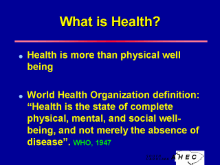 human and fiscal resources, and the religious support system among many others. As early as 1947, the World Health organization was changing the mind set of the world to understand that clean water, clean air, and proper living quarters were just as important as immunizations against disease. The healthy communities movement has adopted this broad definition. Students will have examples of how this has been applied later in the module. |