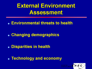 Scanning the external environment: Environmental threats to health can not be ignored. They are of increasing concern due to the ever increasing industrial pollution, destruction of the natural environment due growth and misuse, and naturally occurring events of destruction. Environmental protection, economic stability, social equity, and health of the community are inextricably linked. Visit http://www.scorecard.org Changing demographics will play a significant role in the next few decades. Our aging population is growing, the cultural and racial mix is shifting, and where we come from in the United States is changing. Disparities in health have been demonstrated across the U.S., in the South, Blacks have much poor health than whites. In the West, Hispanics have poorer health than Asians or Whites. Technology and the economics can often have greater impact than any other force on the community. To enter into planning with knowledge of these factors leads to potential failure. |