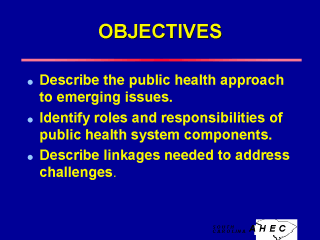 Specific Objectives At the conclusion of this module the learner will be able to: - Describe how the public health approach can be used to address emerging issues or threats to the public’s health. - Identify roles and responsibilities of different components of the public health system in confronting emerging issues. - Describe the linkages needed within the public health system to effectively address these challenges. |