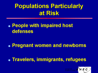 Several groups of people are of special concern and need to be targeted when considering emerging infectious diseases. Persons whose normal host defenses have declined with age or been impaired by illness or medical treatment are more likely to become ill with opportunistic infections. Over the past two decades, the most significant emergence of opportunistic infections has been in persons infected with HIV. Other populations at risk include recipients of bone marrow and solid organ transplants, patients receiving chemotherapy or chronic steroid therapy, burn victims, patients on renal dialysis or with indwelling medical devices, newborns and the elderly. Certain asymptomatic infections in a pregnant woman can increase the risk of prematurity, low birth weight, long term disability, or death. Some infections may be transmitted from mother to child during pregnancy, delivery, or breast feeding. Persons who cross international boundaries (e.g. tourists, workers, immigrants, and refugees) are at increased risk for contracting infectious diseases and can also disseminate diseases to new places. International travel has increased substantially in recent years, and more travelers are visiting remote locations where they can be exposed to infectious agents that are uncommon in their native countries. Immigrants may come from nations where diseases like tuberculosis are endemic, and refugees may come from sites where crowding and malnutrition create ideal conditions for the spread of diseases such as cholera, malaria, measles, and varicella. USDHHS (1998), Preventing Emerging Infectious Diseases: A Strategy for the 21st Century, Atlanta: Centers for Disease Control and Prevention. USDHHS, Morbidity and Mortality Weekly Report, 47(RR-15), September 11, 1998, Atlanta: CDC. |