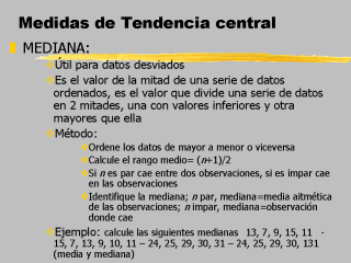 - Es el valor de la mitad de una serie de datos ordenados, es el valor que