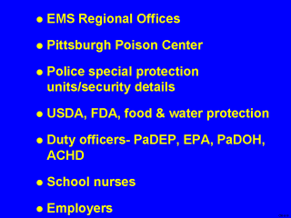 Offices -Pittsburgh Poison Center -Police special protection units/security details -USDA, FDA, food & water protection authorities -Duty officers- PaDEP, EPA, PaDOH, ACHD -School nurses-and student absenteeism -Employer and employee absenteeism |