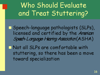 - ASHA is currently certifying stuttering specialists who have additional experience and training with stuttering - Support groups maintain lists of stuttering specialists - The Stuttering Center of Western Pennsylvania |