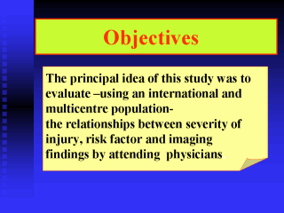 | The principal idea of our research was to evaluate –using an international and multicenter population- the relationships between severity of injury, risk factor and imaging findings by attending physicians. |