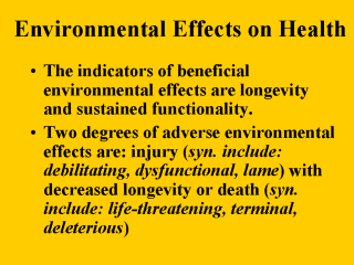 ability to act or function in their environment over a period of time. Longevity depends on accessibility to resources that sustain quality of life. Decreased longevity is an significant indicator of poor health. As well, decreased functionality is another significant indicator of compromised health, not necessarily poor health. ‘Handicapped’ people are still functional, just not to the same ‘normal’ capacity as a majority of people. The inability to function to a personal norm is an indicator of poor health. |