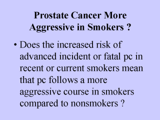 | Two studies have found an association between smoking and advanced stage or poorly differentiated prostate cancer (Daniell 1995 J Urol 154: 153-7; Hussain et al 1992 Int J Radiat Oncol Biol Phys 24: 451-61) which lends further support to this theory, however another 9 studies did not (Le Marchand et al 1994, Severson et al 1989, Thune and Lund 1994, Talamini et al 1993, Giles et al 1996, Slattery and West 1993, Walker et al 1992, Hayes et al 1994, Norrish et al 1998). |