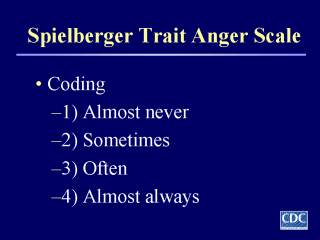 | Trait anger, as assessed by the Spielberger Trait Anger Scale, is a relatively stable personality attribute that is manifested in the frequency, intensity, and duration of the anger experience. Persons with high, compared to low, trait anger are prone to experience mild irritation, rage, and fury more often, more intensely and with longer episodes. |