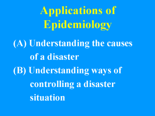 epidemiologic perspective. The epidemiologic investigation of disaster events focuses on two approaches. The first is the typical epidemiologic study of the underlying causes of the disaster. This may focus upon the event itself, or the mortality and morbidity associated with the event. Learning as much as possible about the reasons for disasters is important for developing prevention activities in the future. The second approach is to use epidemiologic methods to investigate mechanisms for alleviating the burden of a disaster once it occurs. This may be applied at the stage of disaster preparedness or at the stage of disaster relief. The most direct application of epidemiology in this situation is the establishment of surveillance systems to identify injuries and the possible emergence of communicable diseases. |