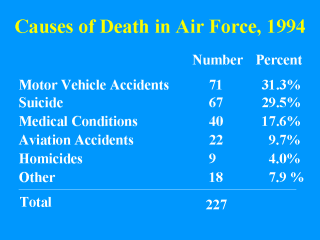 only 10% of all deaths observed in the Air Force. In general, the risks from air travel are perceived to be higher than they actually are. Sources: US Air Force AL/AOP Powell KE, Fingerhut LA, Branche CM, Perrotta DM. Deaths due to Injury in the Military. American Journal of Preventive Medicine 2000; 18(3S):26-32. |