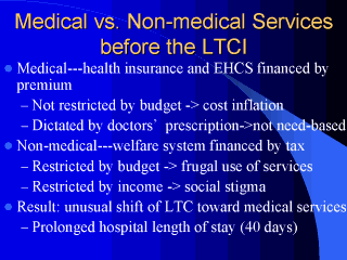 considering the recipients' financial conditions. Japan's LTCI system was created to solve both problems. This is chiefly the reason why Japan's LTCI integrates not only non-medical welfare services but also medical services such as visiting nursing and geriatric hospitals. This is a crucial difference from German LTCI, which covers only non-medical services. Simply put, Japan's LTCI is a total restructuring measure with more advanced and sophisticated features not seen in the existing system. |
