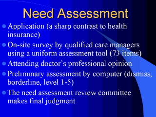 will be entitled to the benefit. A beneficiary must apply to the municipal government and the municipal government send a surveyor to the applicant. The surveyors must be qualified care managers and on-site survey will be conducted using the uniform assessment tool, which consists of 73 survey items to measure ADLs, IADLs and behaviors. The surveyors may record any particular findings to be considered for final assessment but they have no authority to make any judgment. The recorded assessment tools will be evaluated by computer to give preliminary assessment [dismiss, borderline, level1,2,3,4,5]. The municipal governments will also ask attending doctors who are designated in the application forms to submit their professional opinion. The need assessment review committees [NARC] consisting of around five health and welfare professionals will review the surveyors' findings and doctors' professional opinion to decide whether the preliminary assessment should be altered. |