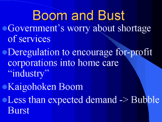 related to the LTC until then. Traditionally the market of medical care and welfare facilities has been closed to for-profit sector. The law precluded for-profit corporations or nonprofessional individuals from running hospitals or nursing homes based on the assumption that for-profit entrepreneurship may unduly exploit the right of patients and disabled people. However such a "not-for-profit" principle was largely loosened under the LTCI system at least in the field of home care [the principle is still held for institutional care]. For-profit corporations are rather encouraged to enter the home care market to boost the service supply. The ban of for-profit corporation to run independent visiting nursing stations [IVNS] was lifted in 1999. The result: many corporations scrambled to the bandwagon to catch the valuable opportunities in the long enduring economic slump. Training courses for home helpers were booked up and many companies waged large scale TV ads to catch customers. |