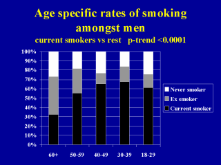 | The differences in smoking behaviour with age are less marked amongst men than women. The proportion of ever-smokers changes little with age although the rate of current smoking declines as smokers quit or die. |