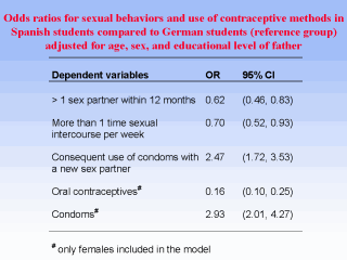 sexual behaviors of interest and for contraception use in females. Looking at sexual behaviors as dependent variable in the logistic regression models we find, that compared to German students as the reference group Spanish students were less likely to have more than one sex partner within the last 12 months (OR 0.59), They were also significantly less likely to have two or more times sexual intercourse per week (OR 0.66). The most striking effect was found for a lower use of oral contraceptives (OR 0.16). We also found a significantly elevated Odds ratio for condom use as contraceptive method among female students (OR 2.79) and for a consequent use of condoms with a new sex partner (OR 2.22) in Spanish students compared to German students. Since these odds ratios were adjusted for age and other differences between the study groups we conclude that some unbiased differences in the sexual behaviors and contraception may exist between German and Spanish students. This leads to the question whether these differences may be accompanied by differences in STD prevalence. |