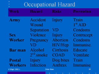 mortality from tetanus and sepsis. Sexually transmitted diseases-gonorrhoea are a commonplace and have a high morbidity. People are under stress, far from their normal sexual partner and the only solace the brothel, the casual sexual encounter, bi-sexual activities, group sex etc.Heavy drinking and sometimes drug misuse are also often part of service life. Modern warfare may involve the use of biological weapons and environmental poisons. Thus the serviceman/woman of today is highly trained, protected with immunisations, given respirator and protective clothing and free condoms. Sex workers are most often women, young, inexperienced and exploited by a pimp. They may be economic refugees and prostitution the only way to support themselves and their children. They are at high risk of venereal diseases, unwanted pregnancy and violence from client or pimp. Bar workers spend hours a day in second hand tobacco smoke working unsociable hours. They will be offered drinks in exchange for conversation and company and they may become heavy drinkers, dependent upon alcohol. |