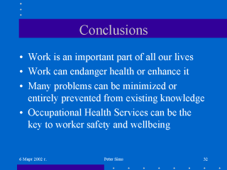 | References: Occupational Health Practice R.S.F.Schilling Butterworths, London 1973 The Diseases of Occupations Donald Hunter Hodder and Stoughton, London 6th Edition 1978 Practical Occupational Medicine A.Seaton and others Edward Arnold, London 3rd impression 1996 |