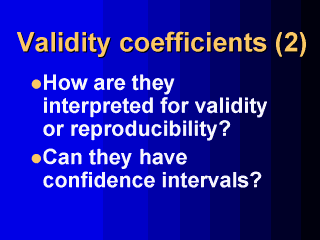 In other cases one method (e.g. the field method) may be repeated (e.g. after a year) to give two values (e.g. Q1 and Q2). Then, as before, compute VCs first using Q1 alone and secondly using Q2. In a case where the method is reproducible, we would expect the VCs obtained using Q1 measurement to be equal to those obtained using Q2 measurements. This is the assessment of reproducibility using the method of triads. Various methods are available for constructing confidence intervals about the VCs. One easy to execute method is the bootstrap method. Here samples of equal size are randomly drawn (with replacement) from the validation study sample for about 500-1000 iterations. Validity coefficients are computed from each sub-sample resulting in a data set with 500-1000 observations (each observation containing a VC for each method). The 5th and 95% percentiles can be computed and used as nonparametric confidence intervals (see references). |