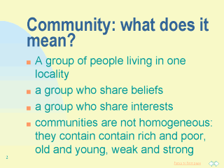 | There are different definitions of community. People may see themselves as