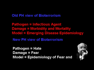 | The old Public Health view of bioterrorism is that of the release of a bug into a population. This bug has not intent. In contrast, the bug in bioterrorism is secondary to hate and fear. |