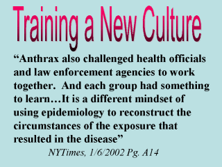 | The third approach to bioterrorism will be to train a new culture. This is a culture who are thinking not only about public health but also criminology. |