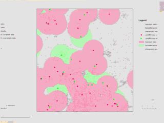 of buffering around landfill sites. Small red points - Exposed postcodes Small green points - Excluded postcodes Small grey points - Unexposed postcodes Big red points - Landfill sites with complete data Big green points - Landfill sites with incomplete data Red area - Exposed area Green area - Excluded area Grey area - Unexposed area |