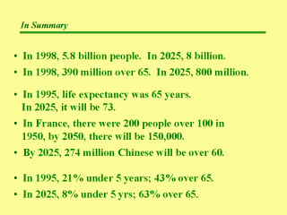 In Summary: Population In 1998, 5.8 Billion. In 2025, 8 Billion (37% ). There were 390 million people over 65 in 1998. In 2025, there will be 800 Million (105% Reaching 20% of the total population.) Life Expectancy Age at Death |
