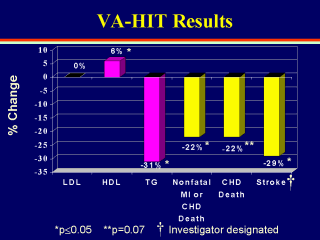 The Veteran Affairs Administration HDL Intervention Trial (VA-HIT) was the first study to examine whether lipid therapy reduces the combined incidences of CAD death and nonfatal MI in men with established CAD who have low levels of HDL with “desirable” levels of LDL. This landmark study provides the first definitive proof that raising HDL reduces the risk of coronary and cerebrovascular events.