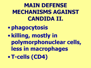 | Neutrophil leukocytes are probably responsible for resistance to invasive candidiasis, and CD4 T-cells are responsible for resistance to mucocutaneous candidiasis. If neutrophil number or function is disturbed, after translocation, Candida goes to lymphatic and blood, spreading throughout the body and causing infection in virtually all organs. |
