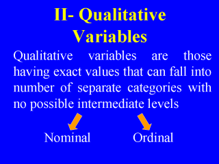 | Data for a qualitative variable have only exact value belonging to only one category with no intermediate values. The discrete variable could be nominal or ordinal. |