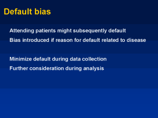 | Additionally, patients that have presented to clinic may subsequently stop attending before the end of a study. If the reasons for this default are related to the disease being studied, survival estimates are likely to be affected. Attempts to minimise default can be made during data collection, with further consideration during data analysis. |