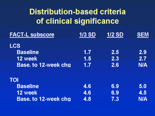 LCS: The first 3 rows under FACT-L subscore. For both the standard deviation and 1 SEM criteria, the anchor-based estimates of 2 to 3 points seem to hold. Focussing on the TOI: The last 3 rows under FACT-L subscore. For both the SD and 1 SEM criteria, the anchor-based estimates of 5 to 6 points seem to hold. |