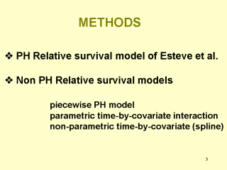 Here, we propose three new models, each of which uses a different approach to incorporate modelling of non-proportional hazards in the relative survival model developped by Jacques Esteve. First, we developed a piecewise PH model, then we have introduced a parametric time-by-covariate interaction in the model of Jacques Esteve. Thirdly we have tried to implement spline functions, with Michal Abrahamowicz’s help and to develop a non parametric time-by-covariate interaction. |