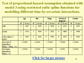 Introducing restricted cubic spline functions for modelling time by covariate interactions in the relative survival model, this new model allows us to formally test the PH hypothesis and to separate the test of lack of any type of time-dependence with the test of linearity of the time-dependence. The results provide strong evidence against the PH hypothesis, which is rejected for all prognostic factors, confirming the need to incorporate modelling of non-proportional hazards in the relative survival analyses. Moreover, it is apparent that in this example the cubic spline model performs better than the linear model, for all prognostic factors.