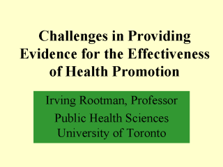 is about the challenges in providing evidence for the effectiveness of health promotion - By the end you should be able to identify key challenges in providing evidence on the effectiveness of health promotion interventions, as well as approaches to meeting them. |