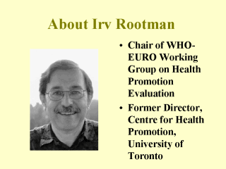Sciences at the University of Toronto. I was: - Chair of a World Health Organization Working Group on Health Promotion Evaluation from 1995-2001 (http://www.who.dk) - Director of the Centre for Health Promotion at the University of Toronto from 1990-2001 - Chief of Health Promotion Studies and Director of Program Resources for the Health Promotion Directorate of the national Department of Health and Welfare in Canada from 1978-1990 (http://www.hc-sc.gc.ca) and - Consultant and Senior Scientist at the World Health Organization in Geneva from 1979-81 (http://www.who.ch) - In all these positions I have been concerned about and involved in developing evidence for practice and policy in health promotion |