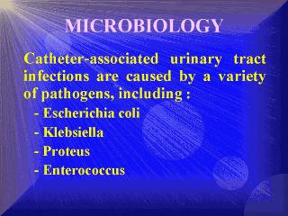 | The causative organisms of catheter-associated urinary tract infections are mainly:Escherichia coli, Klebsiella, Proteus, enterococcus, Pseudomonas, Enterobacter, Serratia, and Candida. Many of these microorganisms are part of the patient's endogenous bowel flora, but they can also be acquired by cross-contamination from other patients or hospital personnel or by exposure to contaminated solutions or non-sterile equipment . |