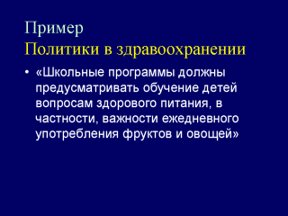 | Example: Policy “Schools are required to teach children about healthy nutrition, in particular, that it is important to eat fruits and vegetables every day.” |