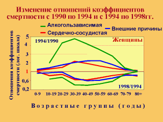 | Аналогичные тенденции в смертности от ССЗ, внешних причин и заболеваний связанных с алкоголем наблюдались и у женщин. Однако, изменения смертности от заболеваний связанных с алкоголем у женщин были более выраженными, чем у мужчин. |