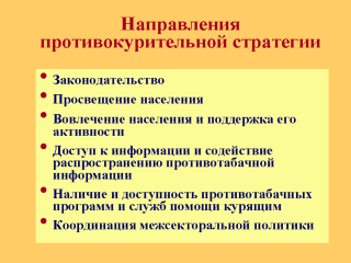 стратегия направлена на: предупреждение курения; прекращение курения; защиту прав и здоровья некурящих. |